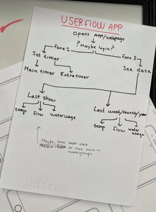 By using a simple diagram we could map out how we would want the interface. Our design goals required us to include the controls of the shower in the interface as well as having a data log. We decided to divide these two interfaces into two tabs. The data log would have further menus where the user would be able to choose between seeing the data from the last shower session or a general statistic of the week/month/year.